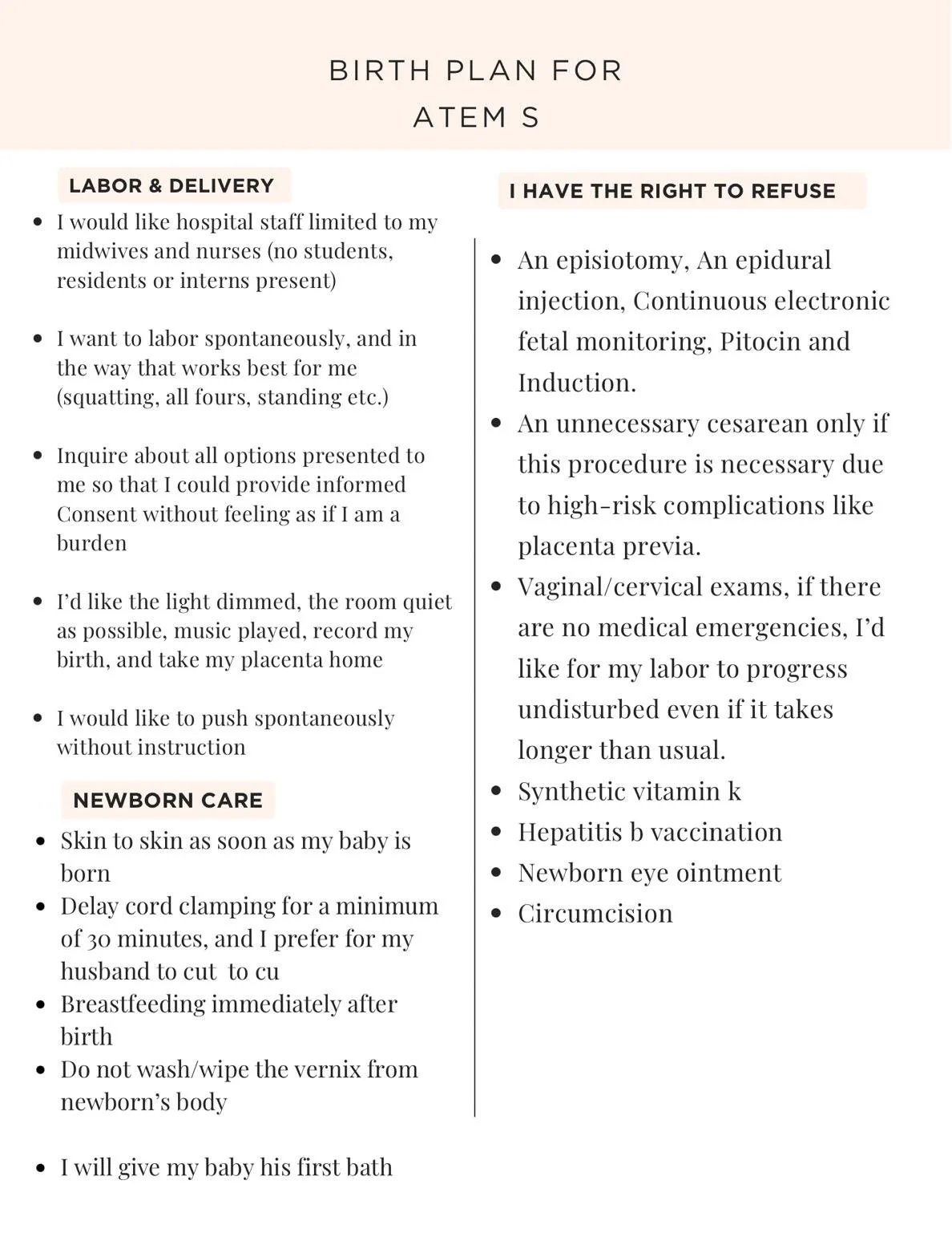Having hard copies of your birth plan readily available for your support team ensures continuity of care, especially if different providers are attending to you during labor and delivery. If I have another hospital birth in the future, I plan on using the same birth plans. They played a significant role in ensuring a positive birthing experience for me. Feel free to use my plan as a starting point in creating your own birth plan.